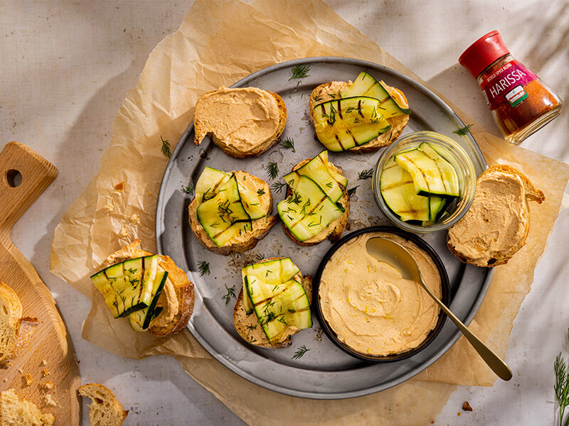 Bruschetta kan niet missen tijdens een high tea. Voor dit recept bedek je het typisch Italiaanse stukje geroosterd brood met courgette en geitenkaascrème. De krokante courgette bruschetta’s zijn lichtpittig van smaak door de World Spice Blend - Harissa. Door de frisse citroensmaak en de vettige geitenkaas in de crème is het gerecht perfect in balans.