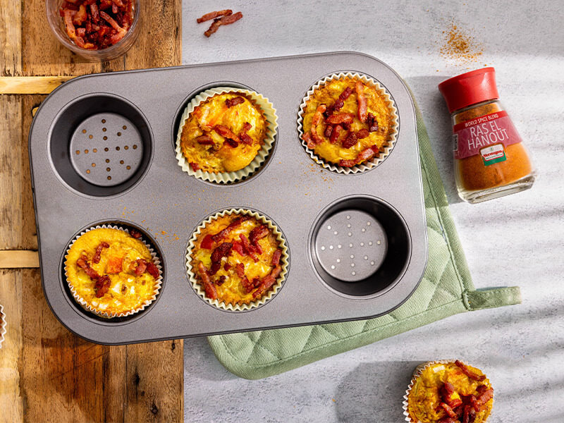 5. Haal de muffins uit de vorm, verdeel de uitgebakken spekjes over de muffins en serveer deze.