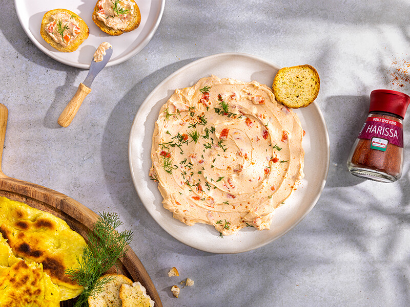 2. Roer de geitenkaas los en voeg hier de gegrilde paprika en World Spice Blend – Harissa aan toe en roer dit door. Garneer met de dille.