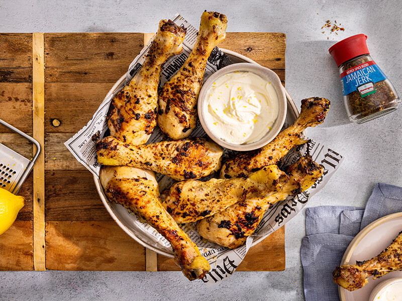 Een lekker kipgerechtje kan niet missen tijdens een ouderwetse borrelavond! Maak eens deze gemarineerde kipdrumsticks uit de oven. Door de World Spice Blend - Jamaican Jerk kruiden krijgt de kip een lekkere pittige smaak. Maak er een dip bij van citroen en crème fraîche als frisse tegenhanger. Genieten!