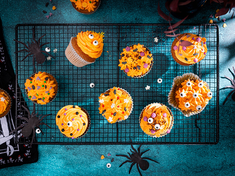 5. Laat de cupcakes helemaal afkoelen voordat de botercrème op de cupcake komt. Verdeel de botercrème over de cupcakes en versier met de Halloween sprinkles.