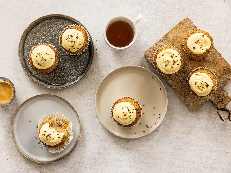7. Laat de muffins afkoelen en spuit de botercrème er op. Rooster de Venkelzaadjes in een droge koekenpan, laat afkoelen en garneer de muffins ermee.