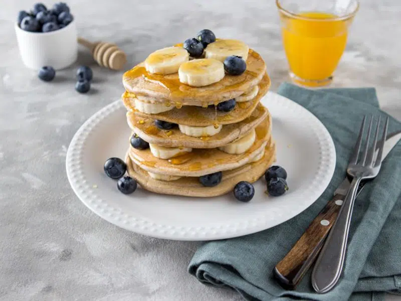 4. Snijd ondertussen de banaan in plakjes. Stapel de pannenkoeken op, met de banaan en blauwe bessen ertussen. Serveer naar smaak met stroop of honing.