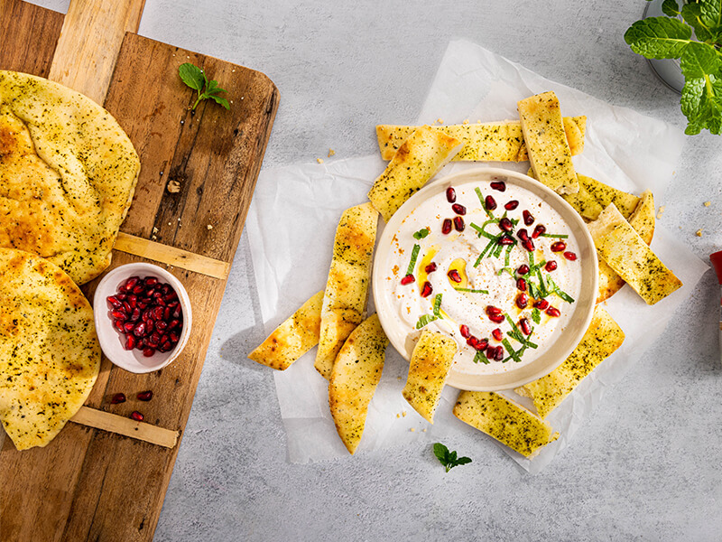 Kan je borrelplank wel een Midden-Oosters tintje gebruiken? Vul de plank dan aan met naanbrood met labneh. Labneh is een zachte kaas, met als basis uitgelekte yoghurt. In deze variant voegen we verse munt en granaatappel toe, waardoor het lekker fris en fruitig wordt. Eet het samen met naanbrood, of als glutenvrije variant met papadums, en je hebt een heerlijke toevoeging aan de borrelavond!