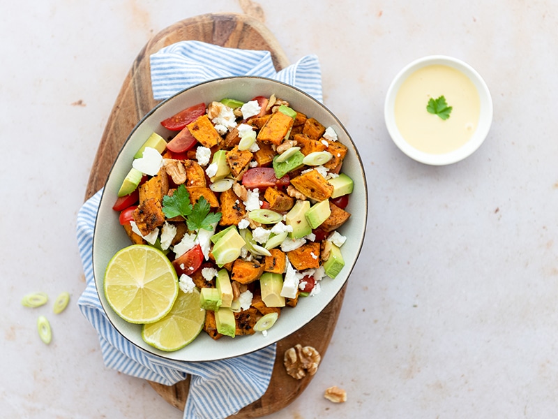 Zoete aardappelsalade met avocado en feta