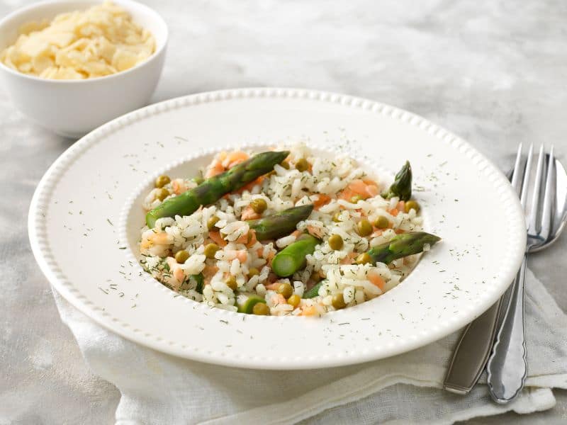 Risotto met zalm, groene asperges en doperwten