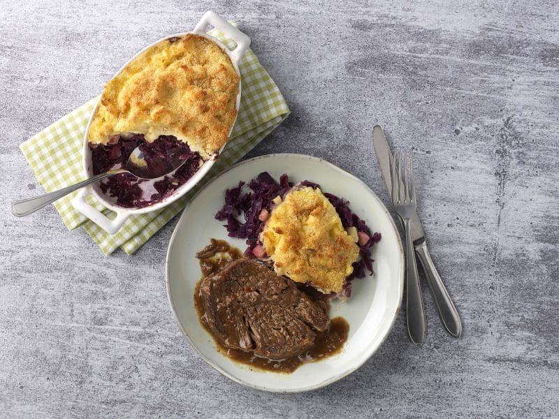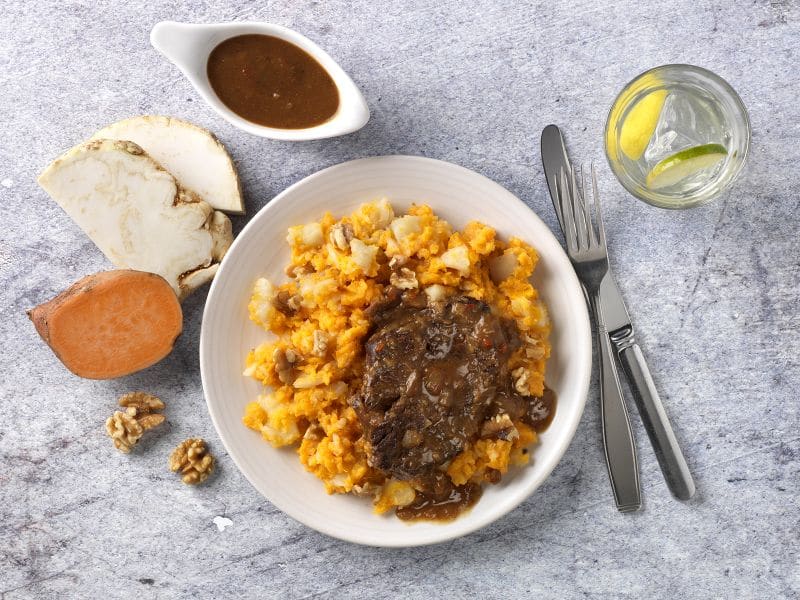 Stoofvlees met knolselderij-zoete aardappelstamppot