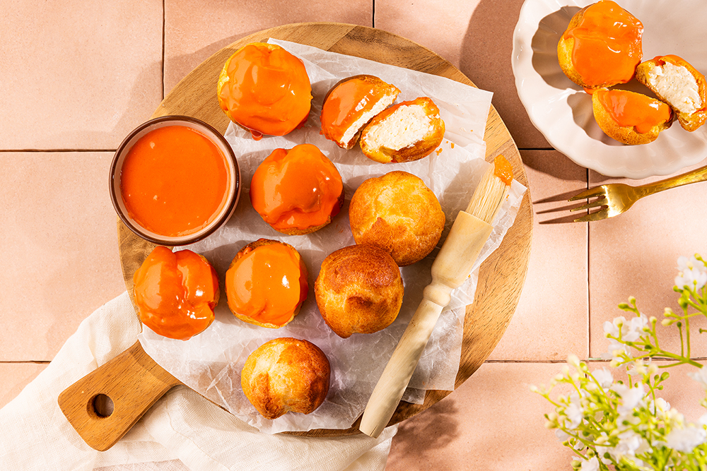 Feestelijke oranje soesjes gevuld met romige vanille-slagroom. Luchtig en perfect gebalanceerd tusse ...