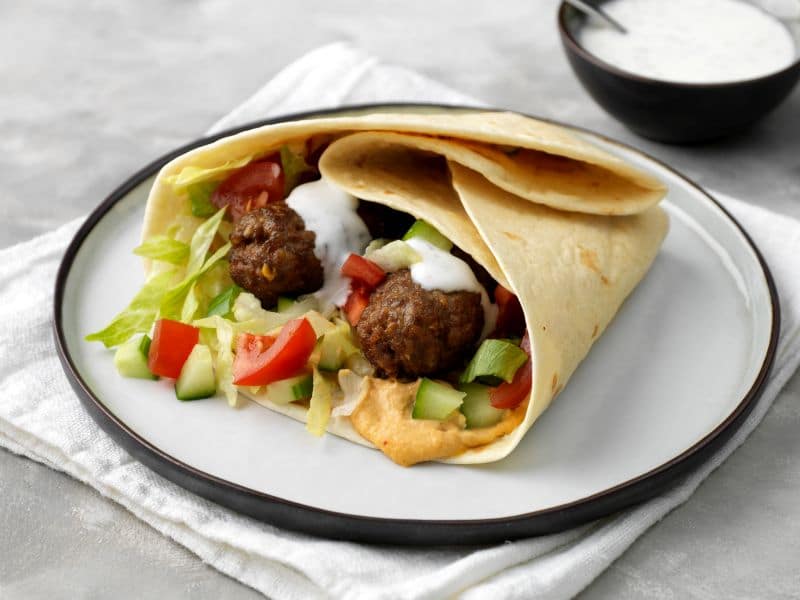 Wraps met beef kofta kebab, hummus en tomaat