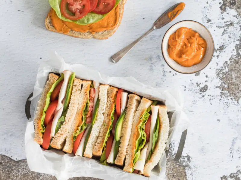 Sandwiches kip, avocado en harissa mayonaise