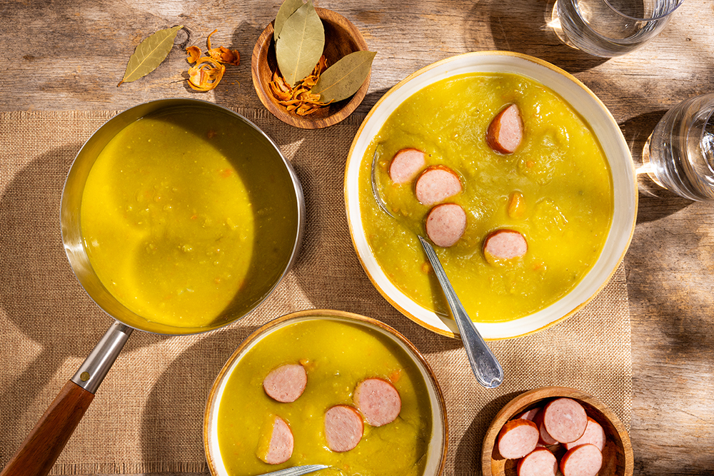 Geniet van Hollandse erwtensoep met rookworst. Hartverwarmend en stevig met laurier en foelie. Het u ...