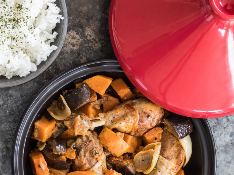 Tajine kip met zoete aardappel en aubergine