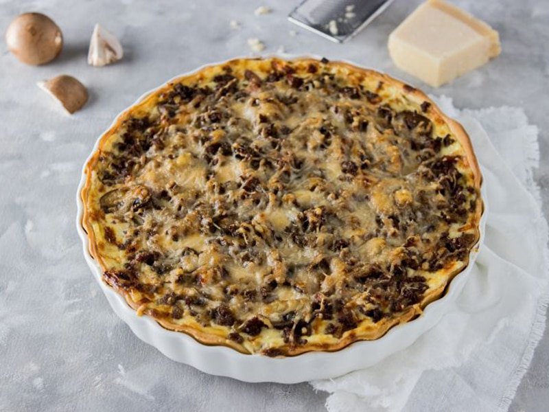 Quiche met gehakt en paddenstoelen
