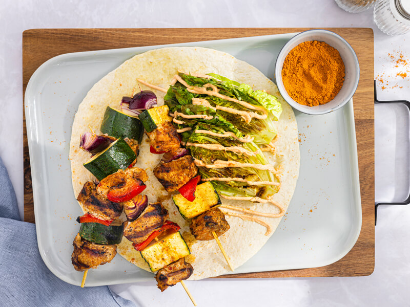 Varkenshaas shaslicks met paprika crème fraîche