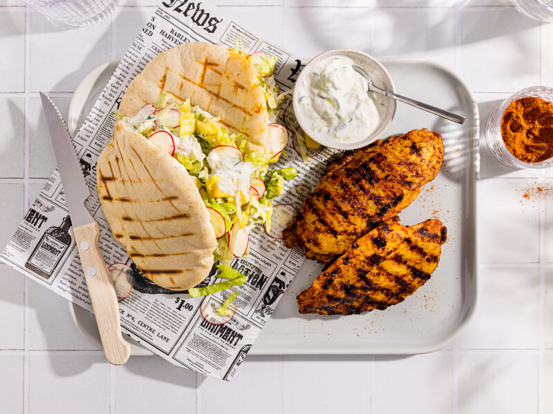 Pikante kip met tzatziki met mango en radijs
