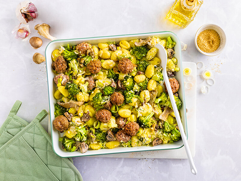 Traybake met gnocchi en gehaktballetjes