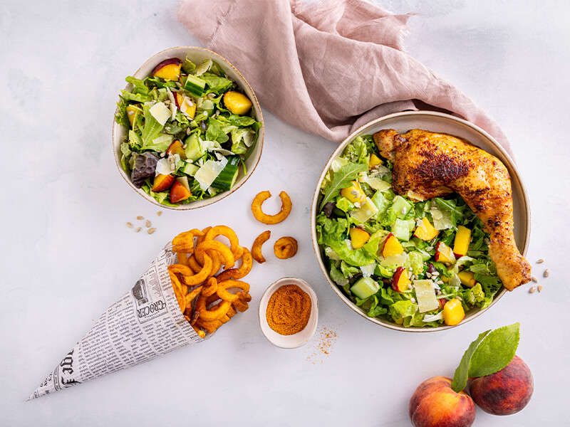 Kippenbout met twisterfriet en perzik salade