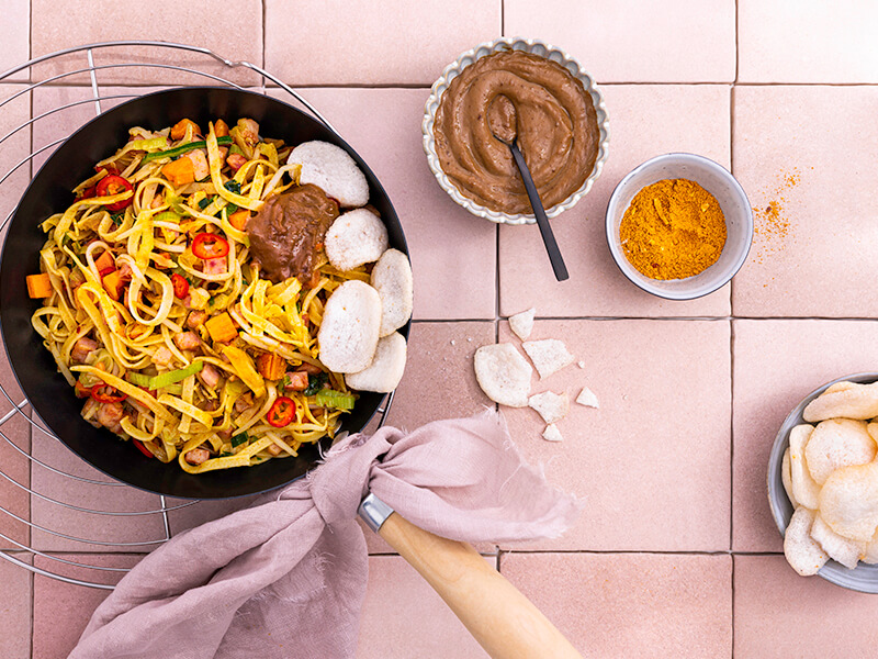 Noedels met wokgroenten en een gefrituurd ei