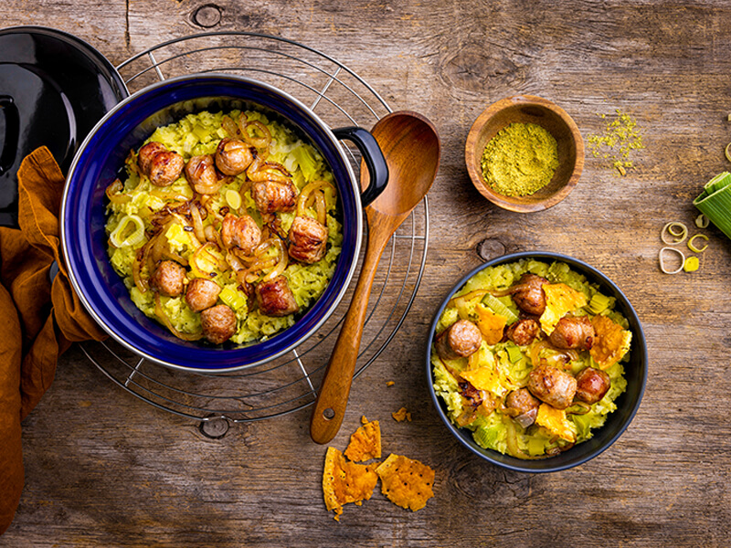 Stamppot prei met braadworst en kaas krokant