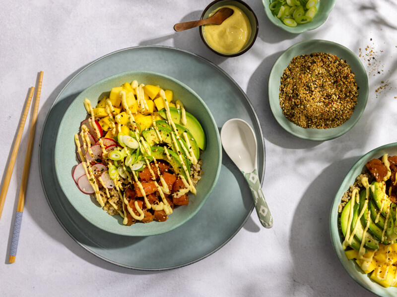 Poké bowl met gemarineerde zalm en mango