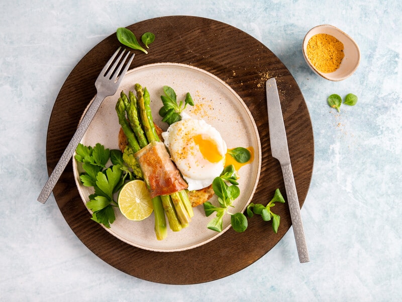 Toast met gepocheerd ei, asperges en ham