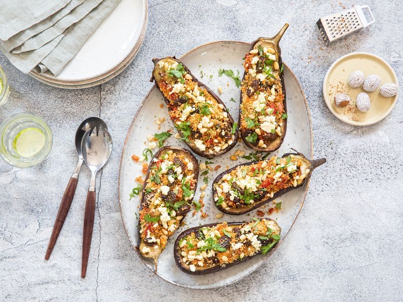 Gevulde aubergine met couscous, feta en pijnboompitten