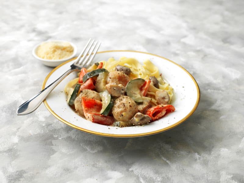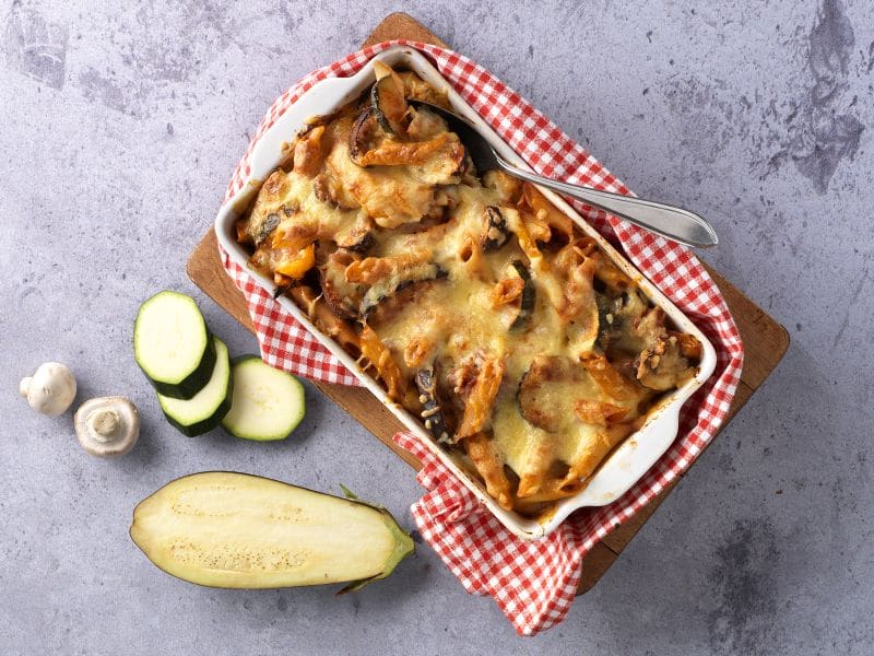 Vegetarische ovenschotel met pasta, courgette en mozzarella