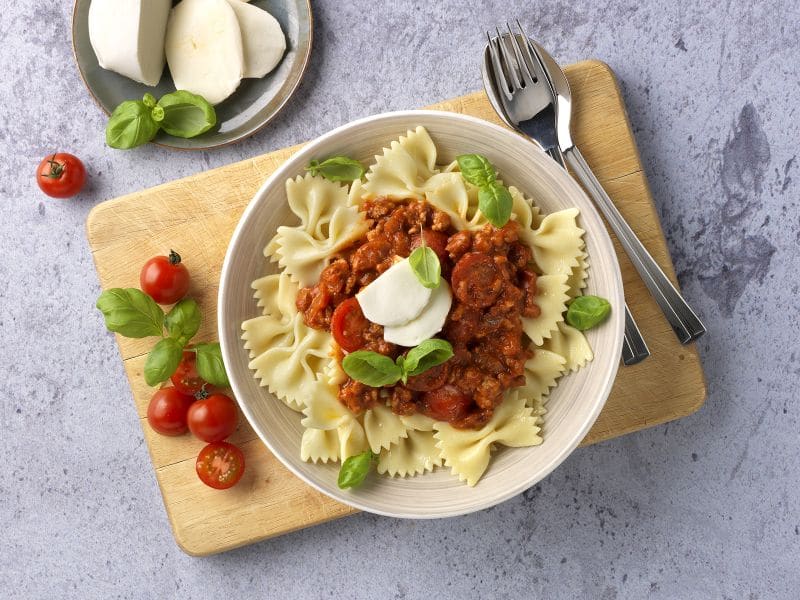 Pasta met gehakt, tomaat en mozzarella