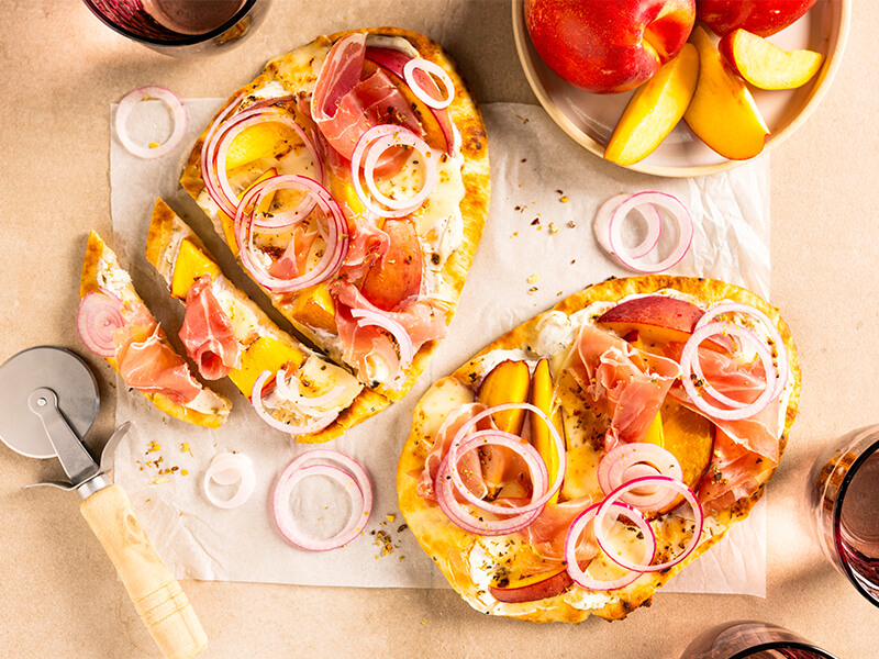Naanpizza met nectarine en prosciutto