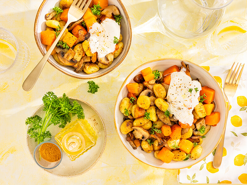 Krokante gnocchi met geroosterde pompoen