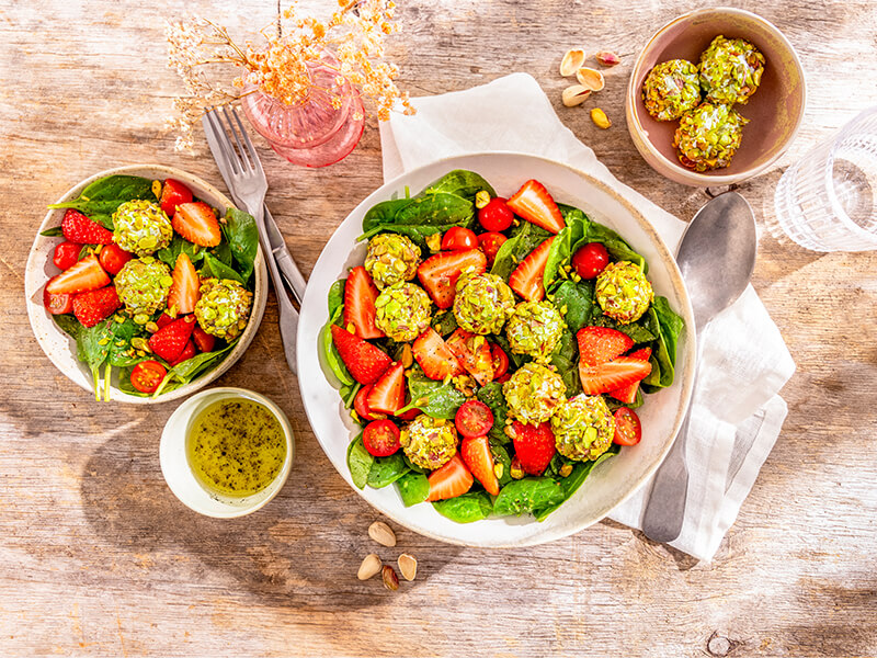 Spinaziesalade met pistache geitenkaasballetjes