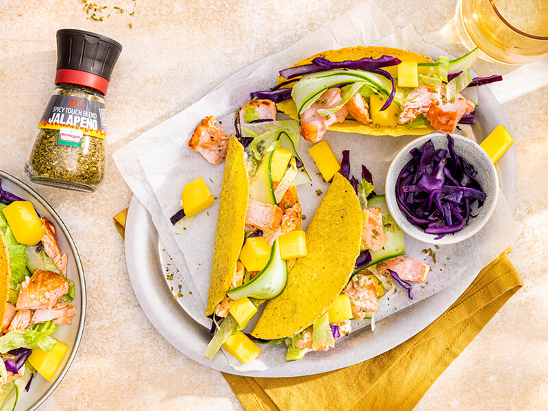 Op een zomerse avond zin in een fris, maar pittig gerecht? Maak dan deze pulled zalm taco’s met ma ...