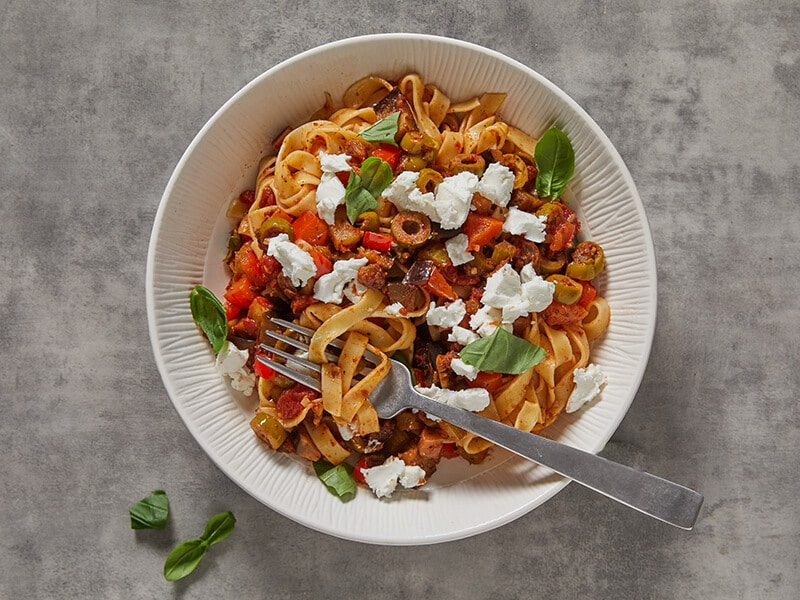 Pasta met caponata, oftewel pittige groenten-tomatensaus. ...