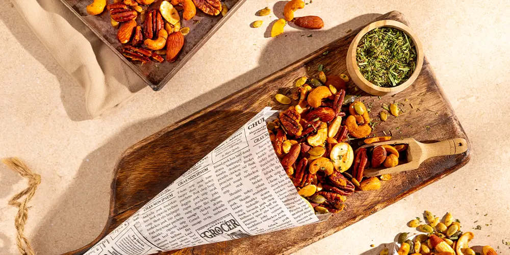 Voeg extra zout flakes toe wanneer de notenmelange niet zoutarm hoeft te zijn.