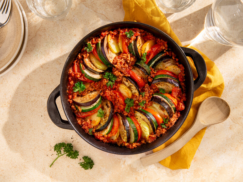 Ratatouille is een heerlijke Franse groentestoof met groenten als courgette, aubergine en tomaten. Het is makkelijk te maken en de oven doet het meeste werk voor je. Wij maken de ratatouille ovenschotel af met klassiek gekruid peulgehakt. Het resultaat is een kleurrijk gerecht, boordevol groenten en vol van smaak!