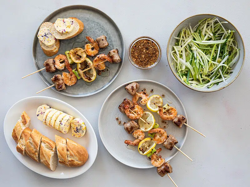 Een heerlijke surf 'n turf spies van braadworst, garnalen, citroen en bosui. Deze spiesjes zijn besprenkeld met een zelfgemaakte knoflookolie, perfect voor op de BBQ.