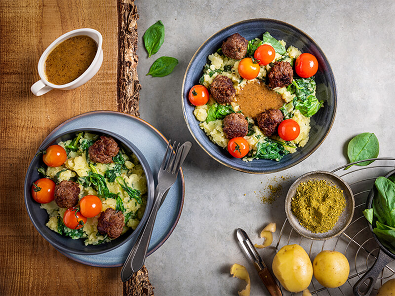 5. Serveer de spinazie stamppot met de gehaktballen en gepofte cherrytomaten. Maak in het midden van de stamppot een kuil en giet hier de jus in.