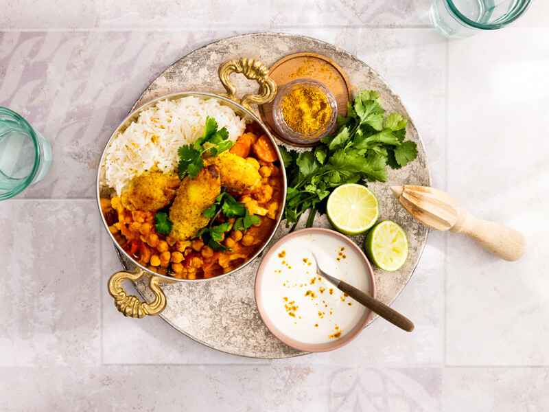 5. Serveer de curry met de rijst, gegrilde kip, koriander, resterende yoghurt en een limoenpartje.