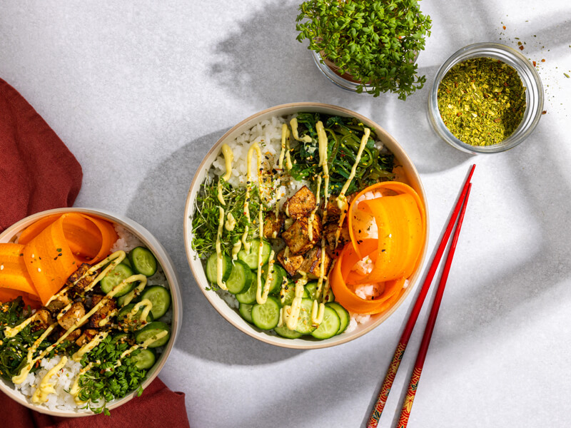 De poké bowl komt van oorsprong uit Hawaii en is al een tijdje populair in Nederland. Deze vegetarische variant bestaat uit gemarineerde tofu en heerlijke zeewiersalade. Met de blend voor Poké Bowl maakt deze vega poké helemaal bowl af.