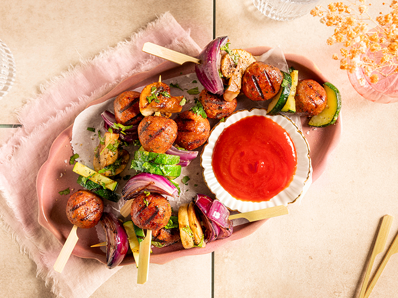 5. Verwarm een grillpan en gril de gemakbal spiezen om en om 9 minuten. Serveer de gemakbal spiesen met de Guilt Free – Tomato Ketchup.