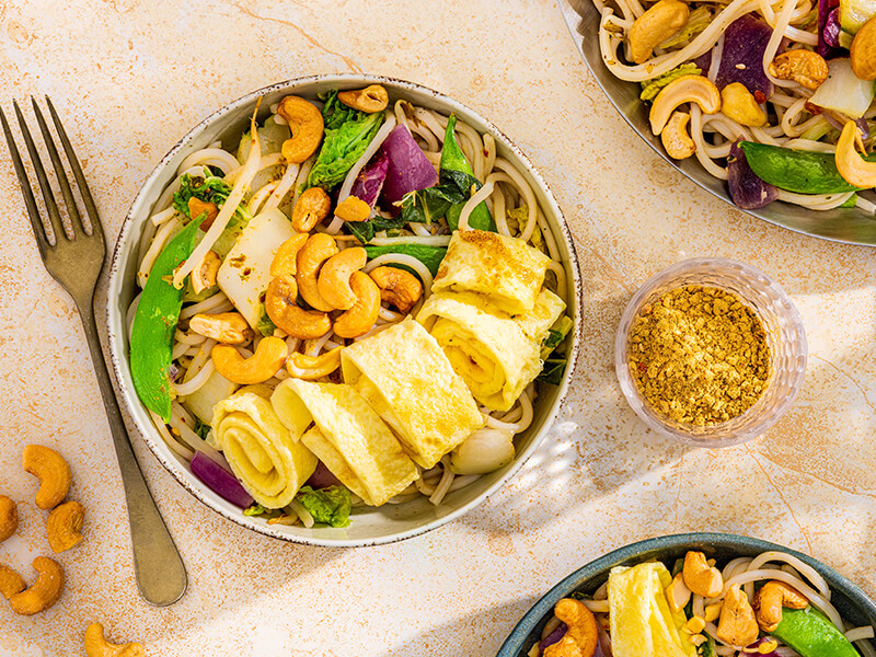 Vegetarische noedels met knapperige groenten, omeletreepjes en cashewnoten. Een supermakkelijke en smaakvolle maaltijd die zo op tafel staat.