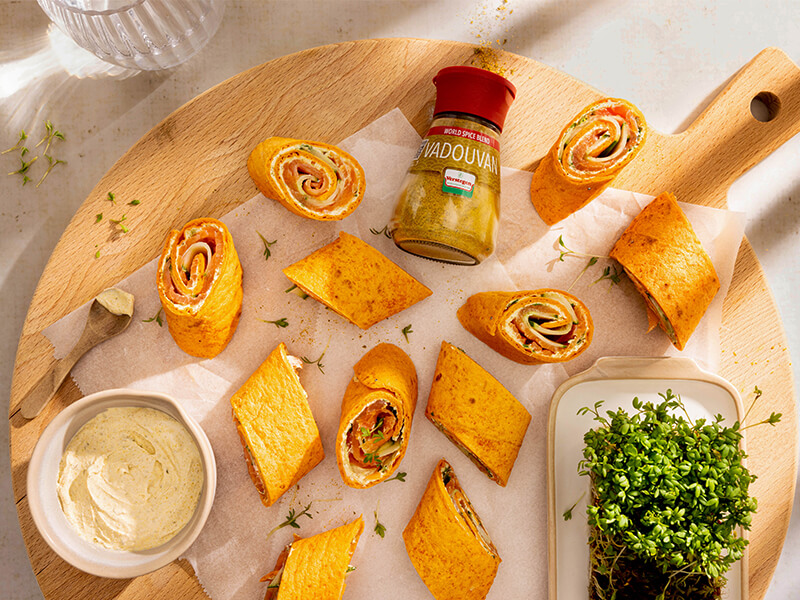 Een hartig visgerecht kan niet missen bij een high tea! Maak daarom deze wrap bites met zalm, tuinkers en crème fraîche. De crème fraîche meng je met de World Spice Blend - Vadouvan kruiden, zodat de wraps een pittige, maar ook licht zoete smaak krijgen. Samen met de frisse komkommer is dit de perfecte smaakcombinatie voor bij de gerookte zalm.