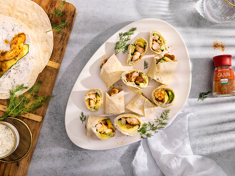 Wraps kunnen natuurlijk niet ontbreken op een borrelplank. Maak daarom eens deze heerlijke wraps, gevuld met gekruide kippendij, gegrilde courgette en roomkaas. De kippendij wordt gekruid met World Spice Blend - Cajun, wat zorgt voor een lekkere, lichtpittige smaak.