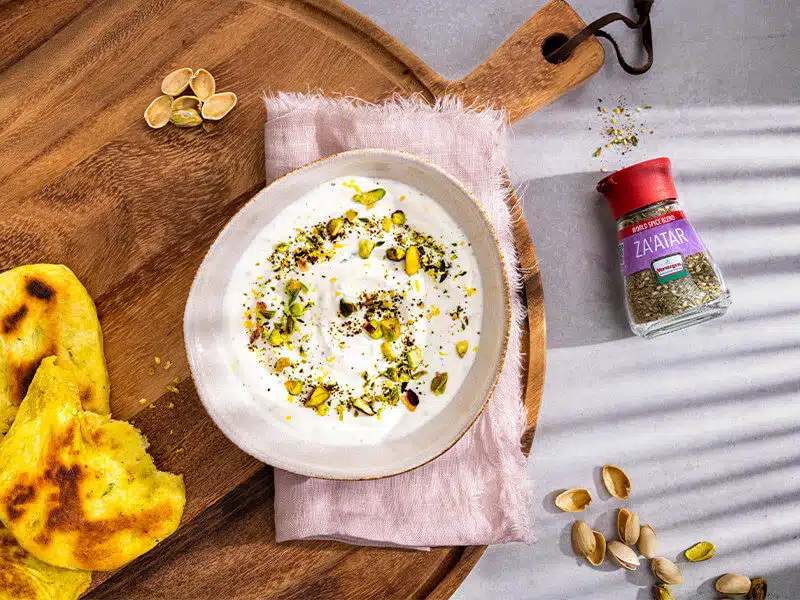 2. Hak de pistache grof, verdeel deze samen met de overige World Spice Blend – Za’atar en olijfolie over de Griekse yoghurt en serveer de yoghurtdip.